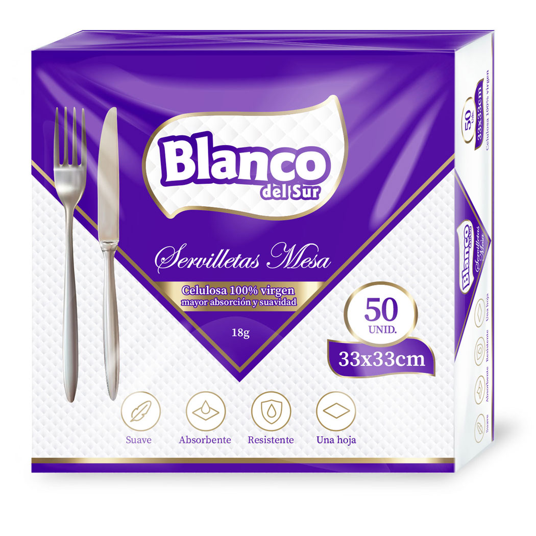 Servilletas de mesa Blanco del Sur de 33×33 cm, paquete de 50 unidades. Fabricadas con celulosa 100% virgen, ofrecen mayor absorción, suavidad y resistencia. Perfectas para el hogar y restaurantes.
