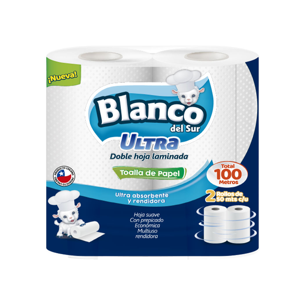 Paquete de 2 rollos de toalla Blanco del Sur Ultra de 50 metros cada uno. Doble hoja laminada de alta absorción. Multiuso, económica y ultra rendidora para todo tipo de limpieza.