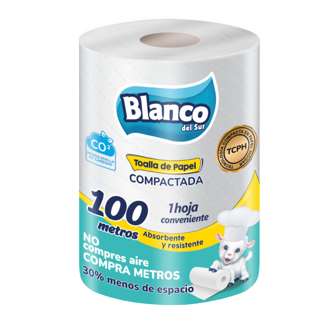 Toalla de papel compactada Blanco del Sur de 100 metros, 1 hoja conveniente. Ofrece 30% menos espacio y máxima absorción. Ideal para cocina, limpieza y uso institucional.